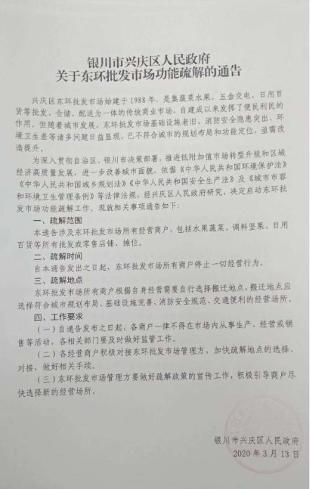 新聞中心3月13日,興慶區(qū)人民政府正式發(fā)布了《銀川市興慶區(qū)人民政府關(guān)于東環(huán)批發(fā)市場功能疏解的通告》。通告肯定東環(huán)市場的歷史功用,同時指出現(xiàn)階段,東環(huán)市場已經(jīng)不能滿足城市規(guī)劃布局及功能定位的發(fā)展需要,并就東環(huán)市場的的功能疏解事宜給出了具體指導(dǎo)及工作要求,東環(huán)動遷已成定局。