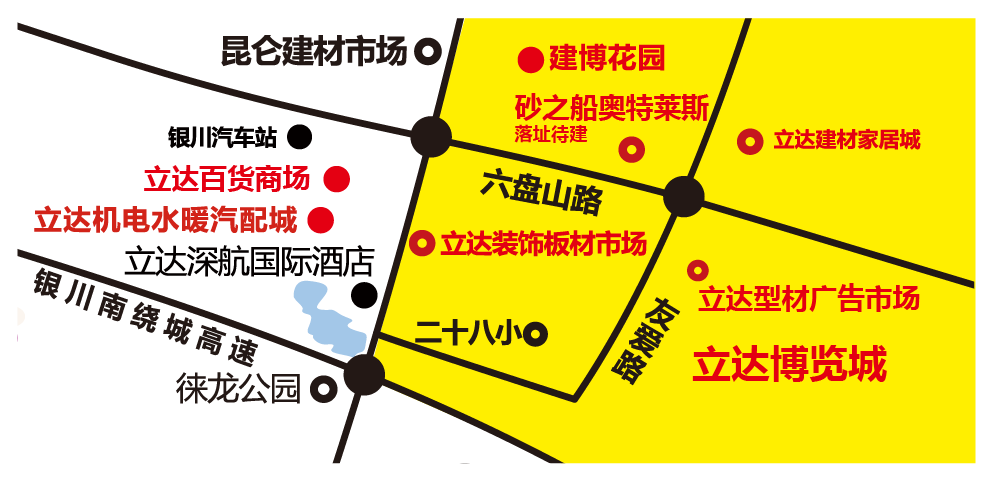 立達博覽城68#地,南至規(guī)劃路,北至六盤山路,東至燕慶路,西接交通物流要道友愛路,暢通四方,收發(fā)貨方便,高效配送全國,同時市場內(nèi)自配物流,立達型材廣告市場百米內(nèi)配套大型物流園,百條線路暢達全國,有效降低商戶運輸成本,提高配送效率,物流高效便捷。